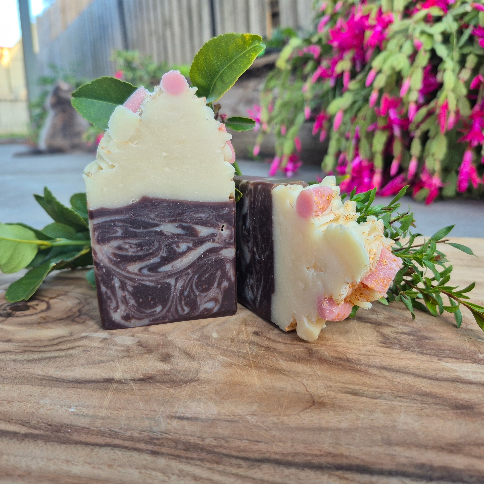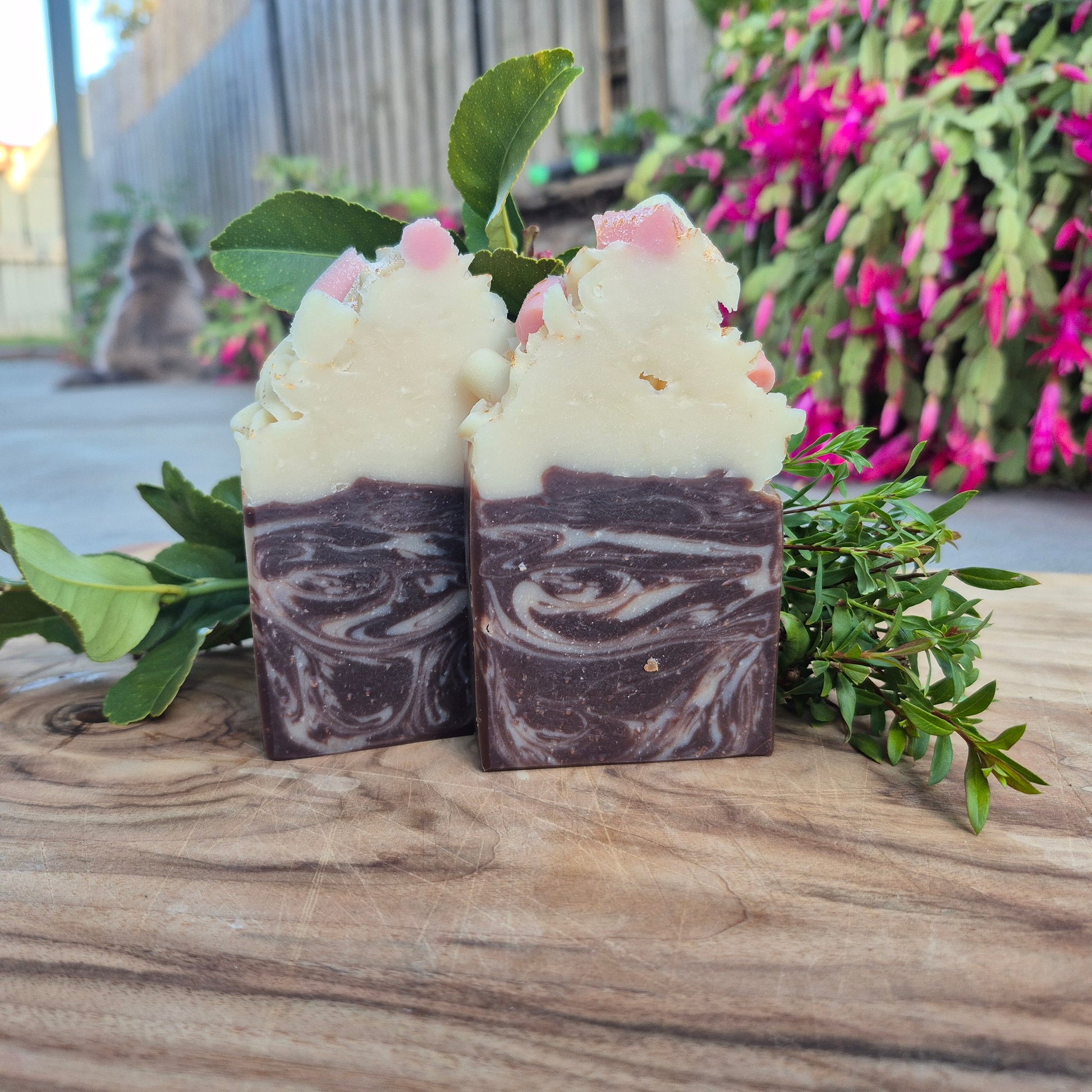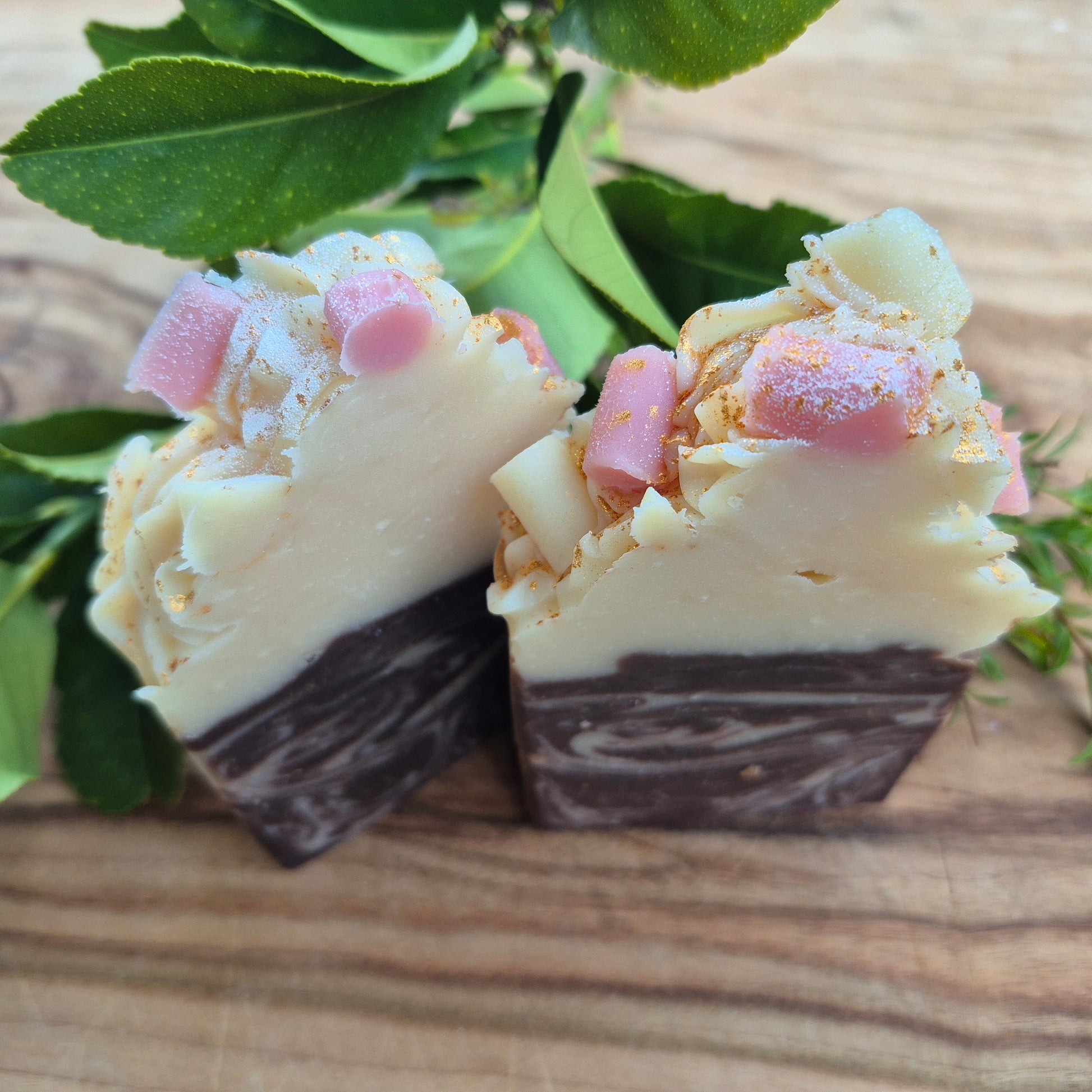 Hot Chocolate! This is such a fun soap bar! I have fraganced this bar with natural cocoa powder and with alittle warm vanilla fragrance oil. I have then topped the bar with pink and white soap marshmallows, dusted the bar with gold mica and then with some biodegradable glitter.